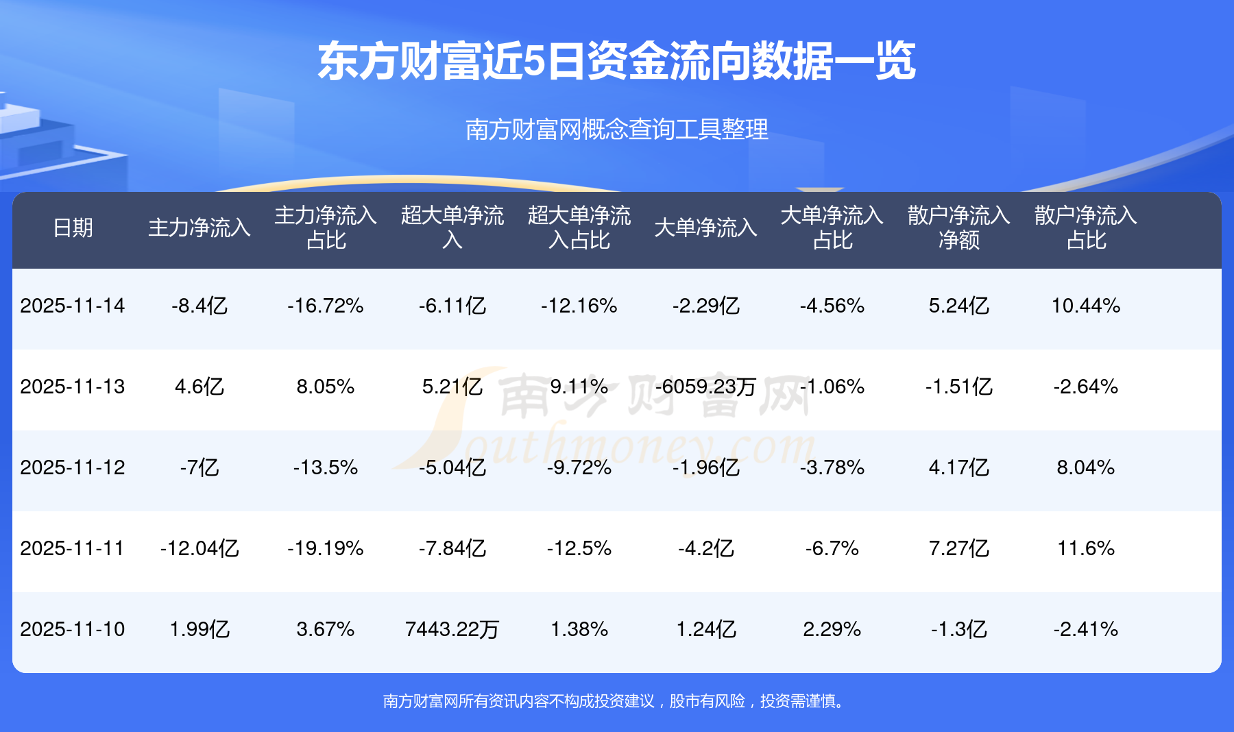 11月14日該股主力凈流出8.4億元,超大單凈流出6.11億元,大單凈流出2.29億元,中單凈流入3.15億元,散戶凈流入5.24億元。