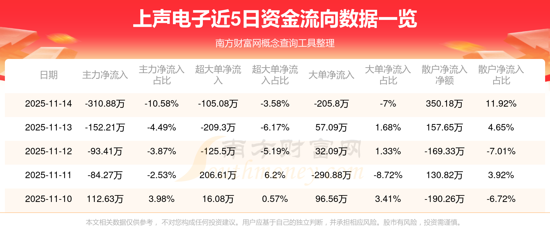 11月14日消息,上聲電子主力凈流出310.88萬元,超大單凈流出105.08萬元,散戶凈流入350.18萬元。
