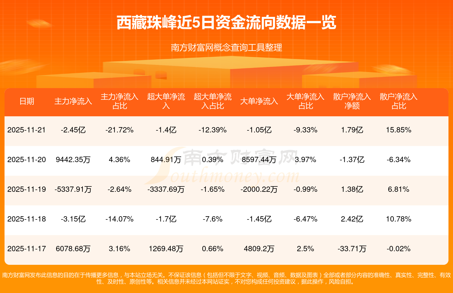 11月21日消息,西藏珠峰資金凈流出2.45億元,超大單凈流出1.4億元,換手率8.16%,成交金額11.27億元。