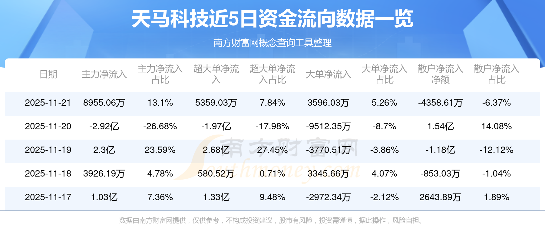 11月21日消息,天馬科技11月21日主力資金凈流入8955.06萬元,超大單資金凈流入5359.03萬元,大單資金凈流入3596.03萬元,散戶資金凈流出4358.61萬元。