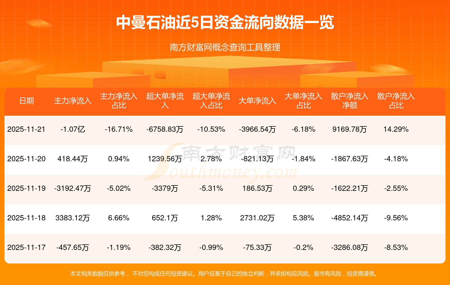 11月21日消息,中曼石油主力資金凈流出1.07億元,超大單資金凈流出6758.83萬元,散戶資金凈流入9169.78萬元。