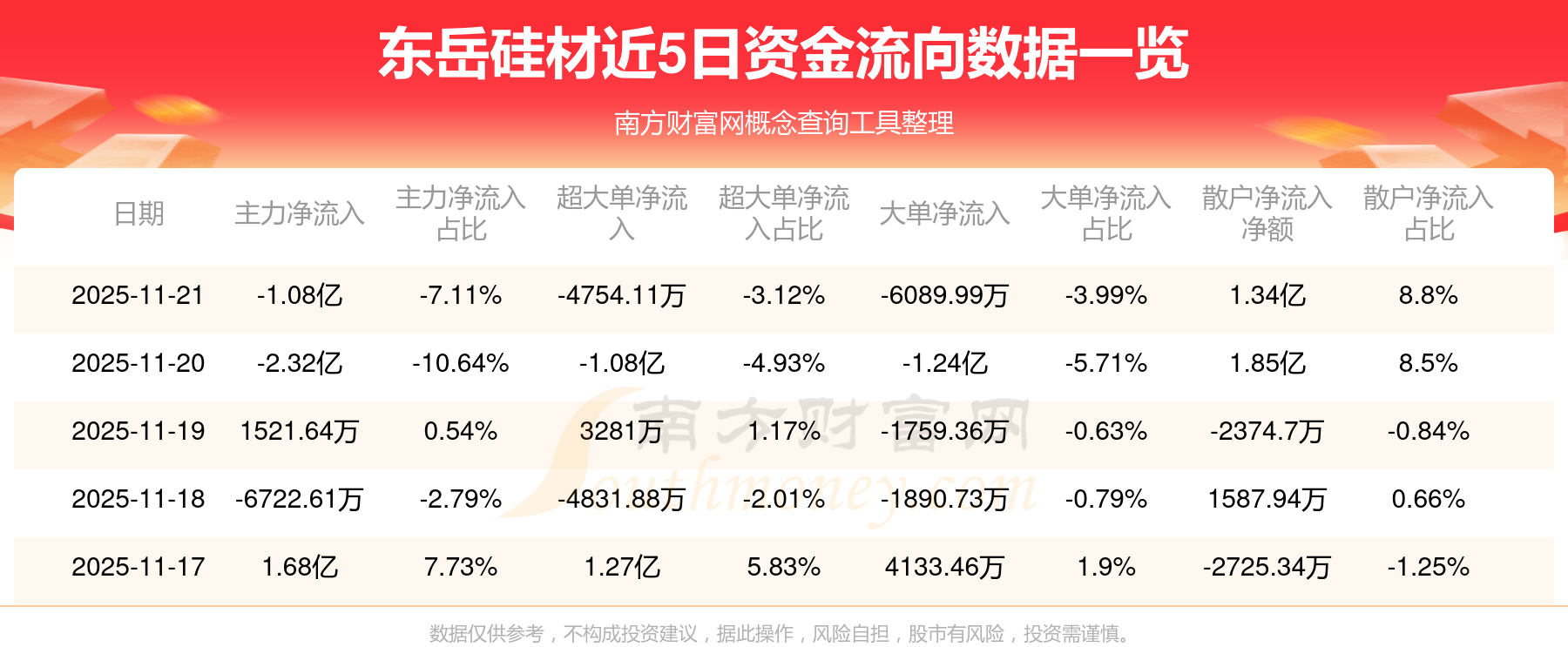 11月21日消息,東岳硅材11月21日主力凈流出1.08億元,超大單凈流出4754.11萬元,大單凈流出6089.99萬元,散戶凈流入1.34億元。