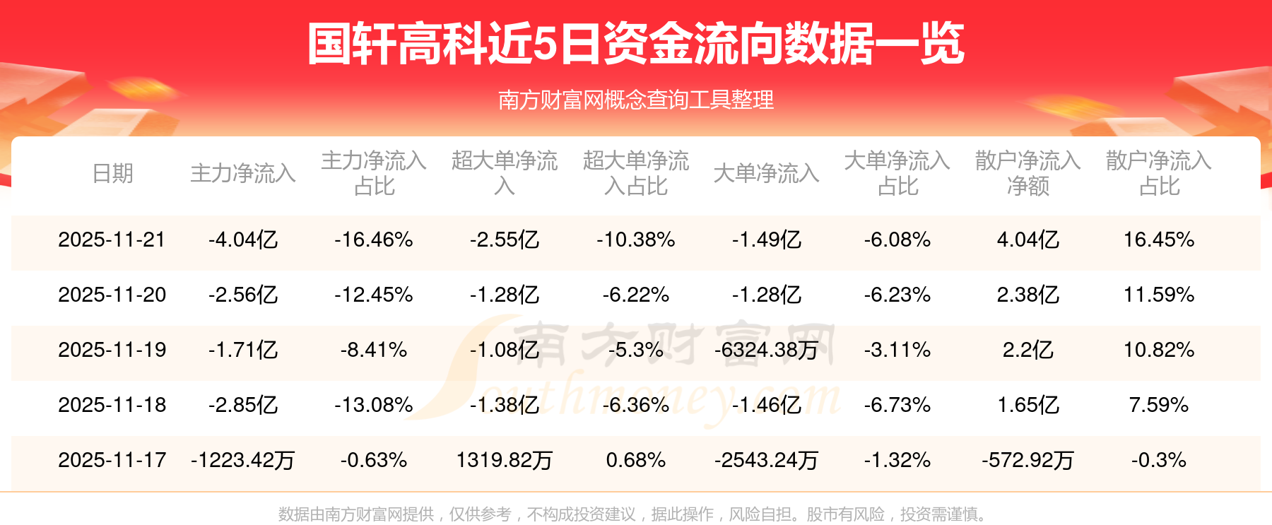 資金流向數(shù)據(jù)方面,11月21日主力資金凈流流出4.04億元,超大單資金凈流出2.55億元,大單資金凈流出1.49億元,散戶資金凈流入4.04億元。