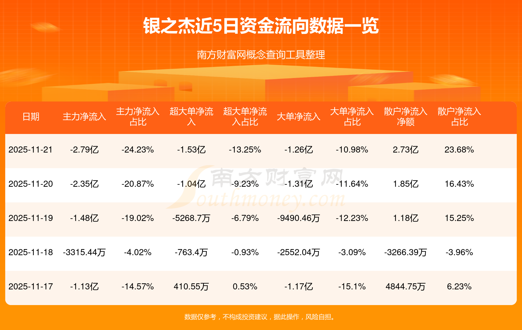 11月21日消息,銀之杰11月21日主力凈流出2.79億元,超大單凈流出1.53億元,大單凈流出1.26億元,散戶凈流入2.73億元。