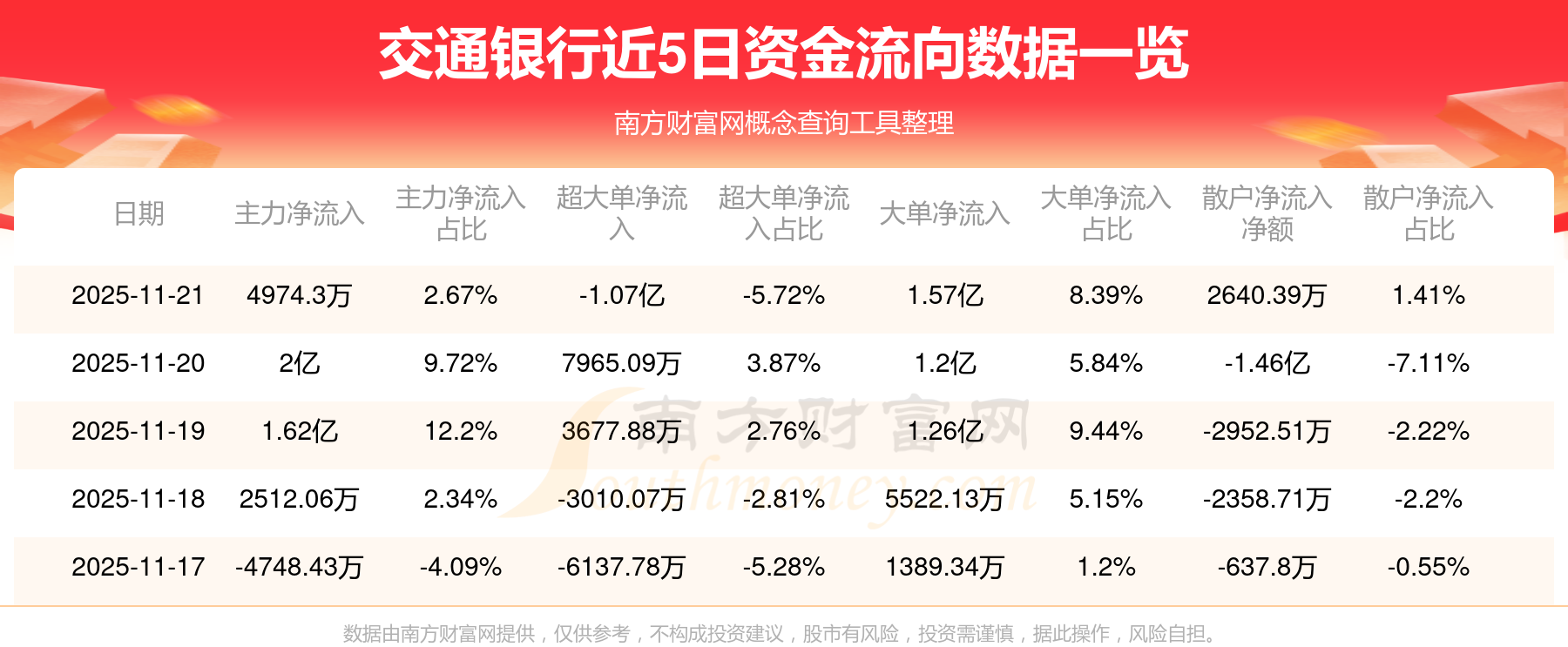 近5日資金流向一覽見下表: