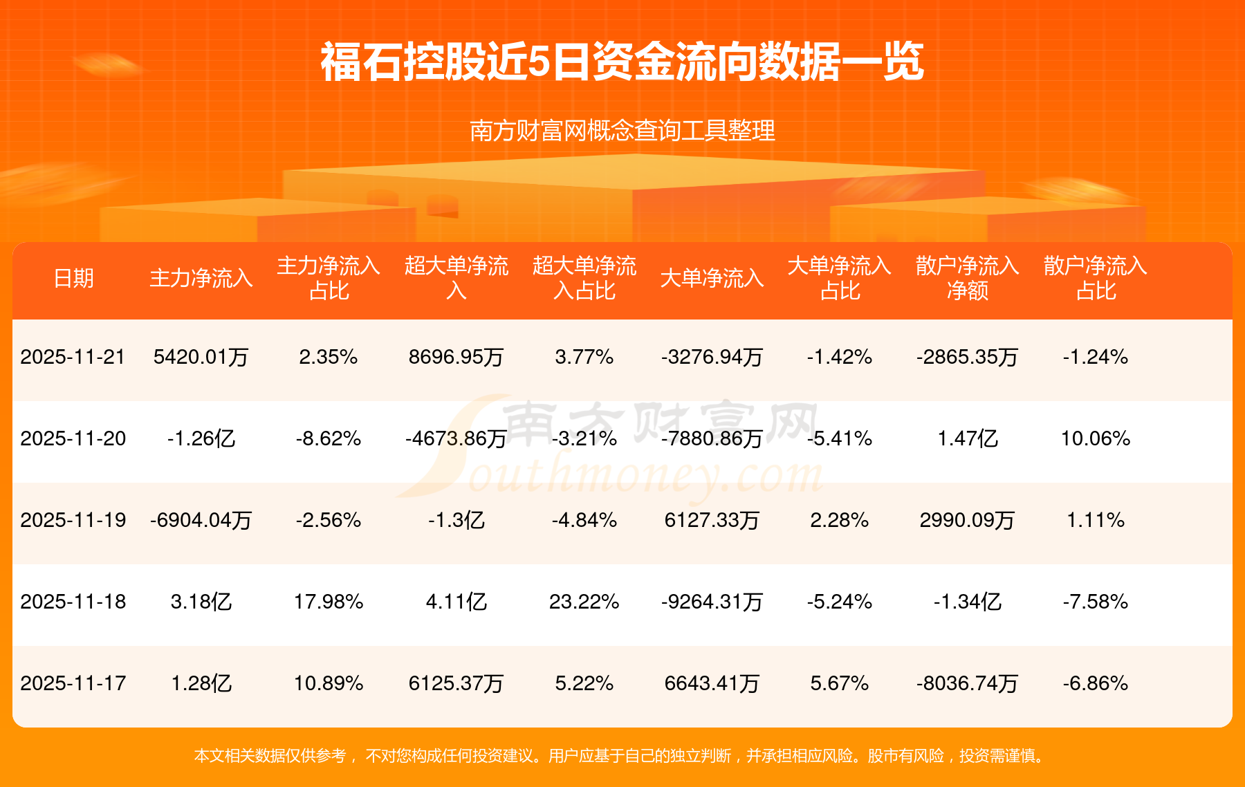 11月21日消息,福石控股資金凈流入5420.01萬元,超大單凈流入8696.95萬元,換手率33.82%,成交金額23.05億元。