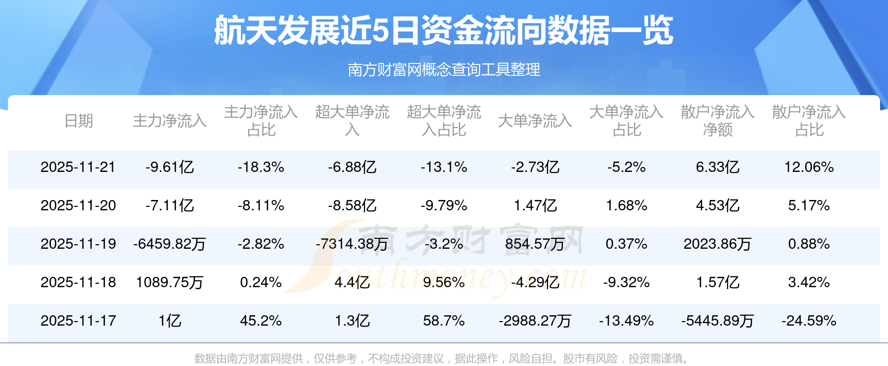 11月21日消息,航天發(fā)展11月21日主力凈流出9.61億元,超大單凈流出6.88億元,大單凈流出2.73億元,散戶凈流入6.33億元。