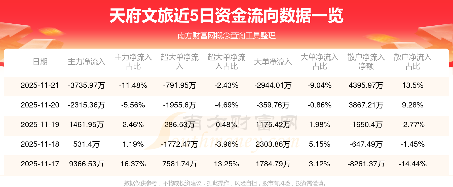 11月21日消息,天府文旅11月21日主力凈流出3735.97萬元,超大單凈流出791.95萬元,大單凈流出2944.01萬元,散戶凈流入4395.97萬元。
