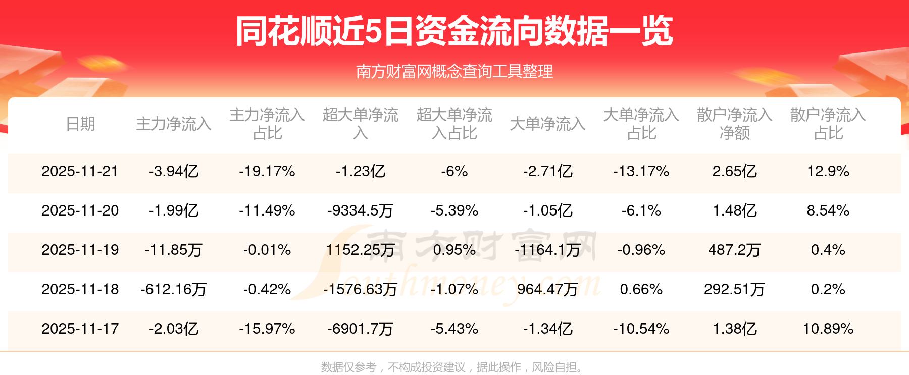 11月21日消息,同花順資金凈流出3.94億元,超大單凈流出1.23億元,換手率2.35%,成交金額20.54億元。
