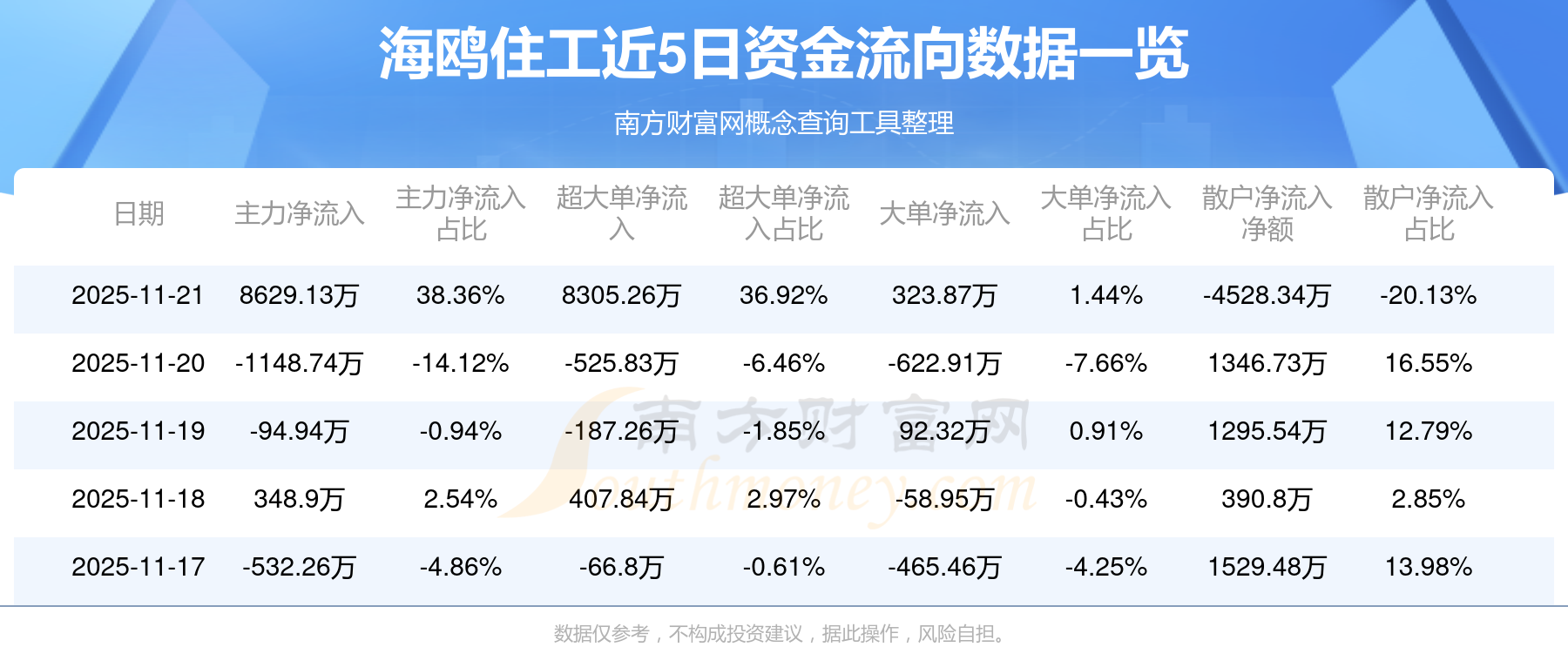 11月21日消息,海鷗住工11月21日主力凈流入8629.13萬元,超大單凈流入8305.26萬元,大單凈流入323.87萬元,散戶凈流出4528.34萬元。