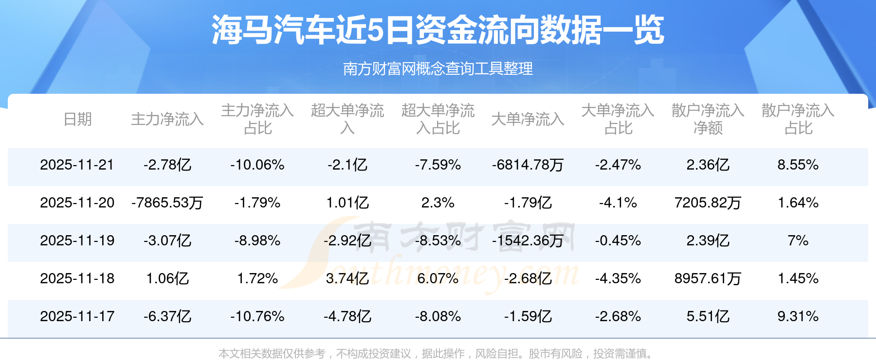 11月21日消息,海馬汽車主力資金凈流出2.78億元,超大單資金凈流出2.1億元,散戶資金凈流入2.36億元。