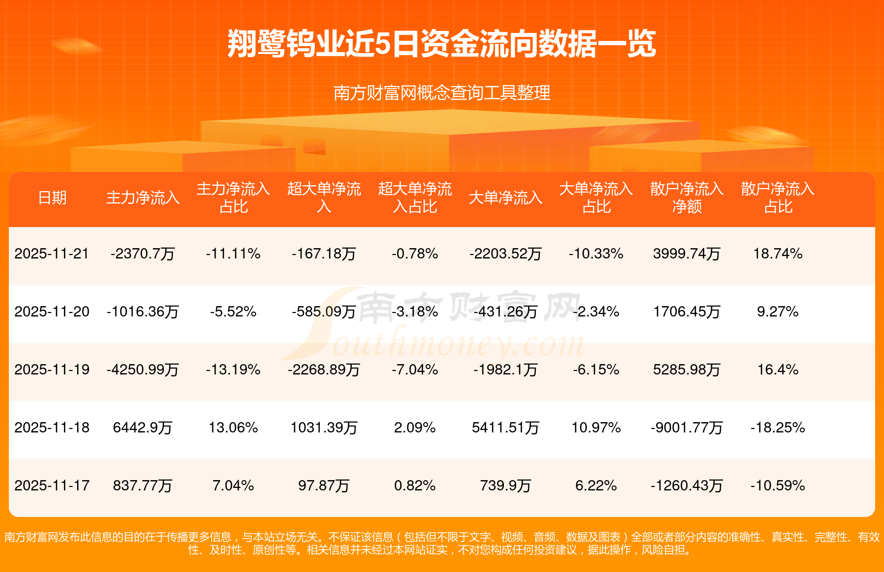 11月21日消息,翔鷺鎢業(yè)資金凈流出2370.7萬元,超大單凈流出167.18萬元,換手率7.24%,成交金額2.13億元。