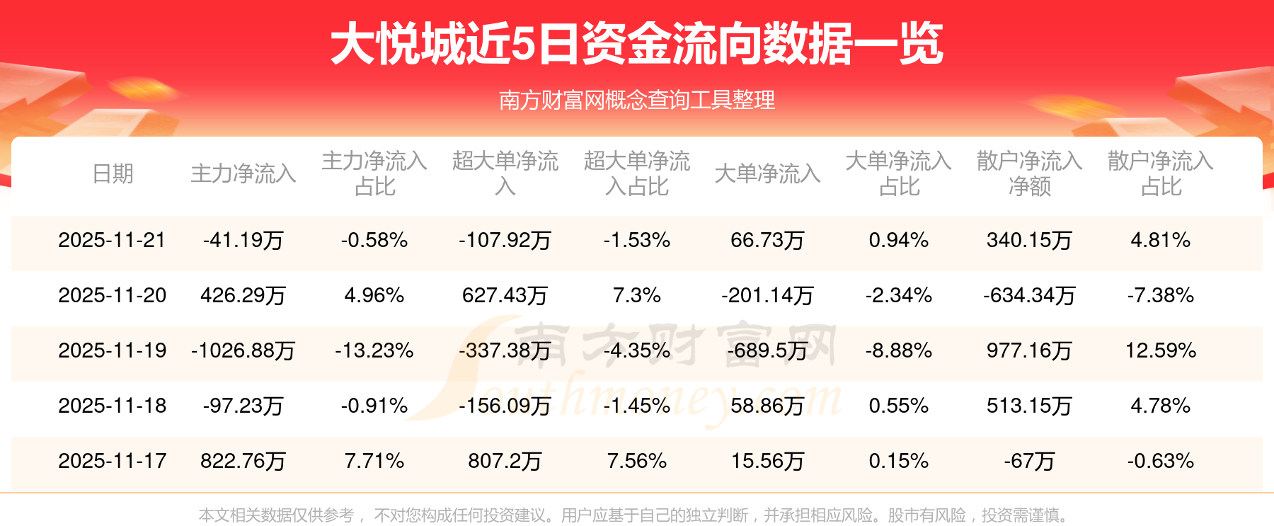 11月21日消息,大悅城11月21日主力資金凈流出41.19萬元,超大單資金凈流出107.92萬元,大單資金凈流入66.73萬元,散戶資金凈流入340.15萬元。