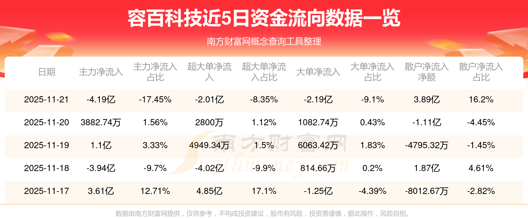 11月21日消息,容百科技11月21日主力凈流出4.19億元,超大單凈流出2.01億元,大單凈流出2.19億元,散戶凈流入3.89億元。