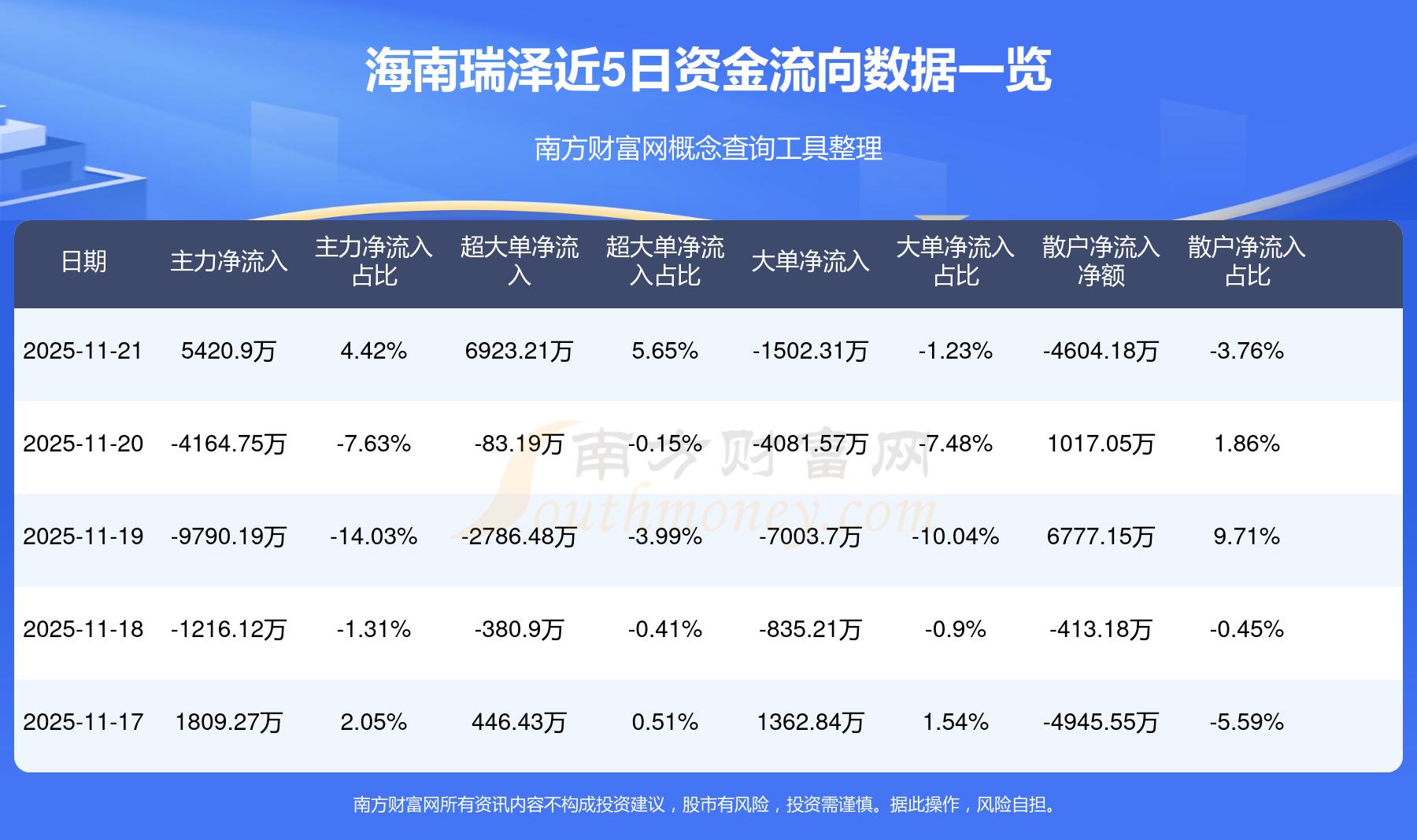 11月21日消息,海南瑞澤11月21日主力凈流入5420.9萬元,超大單凈流入6923.21萬元,大單凈流出1502.31萬元,散戶凈流出4604.18萬元。