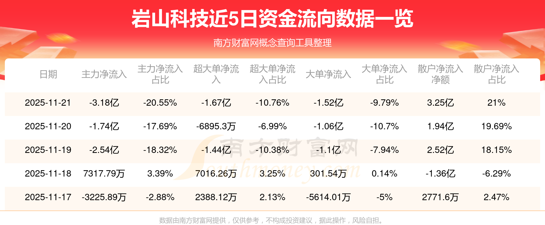 11月21日消息,巖山科技資金凈流出3.18億元,超大單資金凈流出1.67億元,換手率4.01%,成交金額15.48億元。
