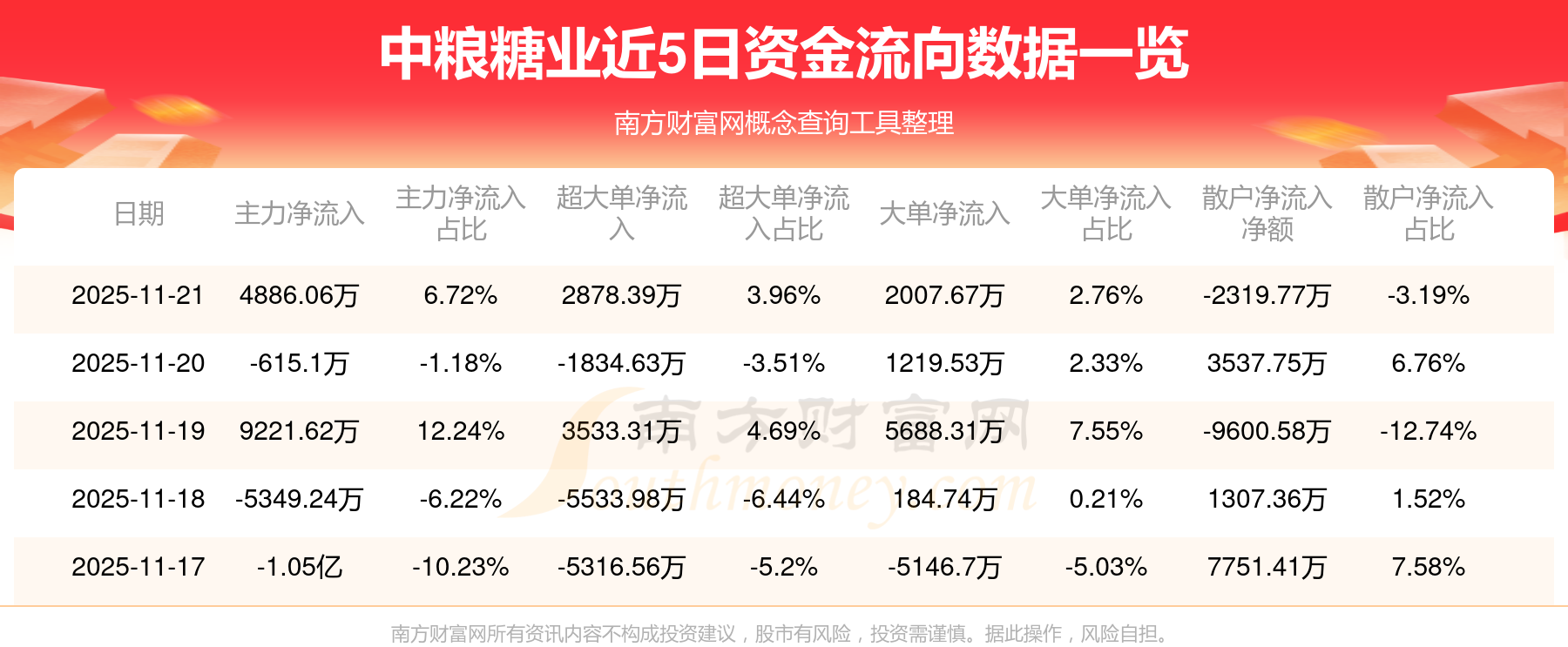 11月21日消息,中糧糖業(yè)主力凈流入4886.06萬元,超大單凈流入2878.39萬元,散戶凈流出2319.77萬元。