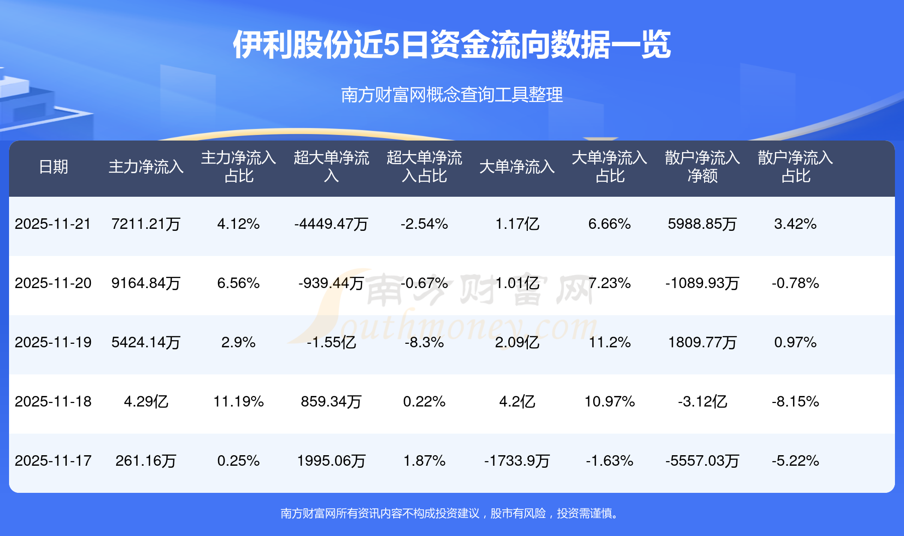 11月21日消息,伊利股份資金凈流入7211.21萬元,超大單凈流出4449.47萬元,換手率0.94%,成交金額17.33億元。