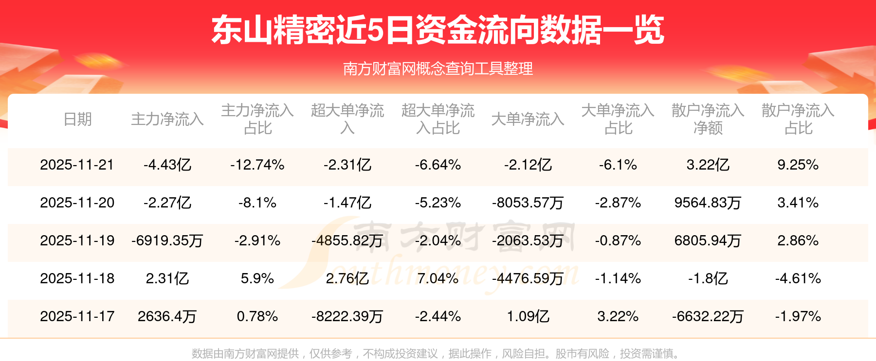 11月21日該股主力凈流出4.43億元,超大單凈流出2.31億元,大單凈流出2.12億元,中單凈流入1.21億元,散戶凈流入3.22億元。