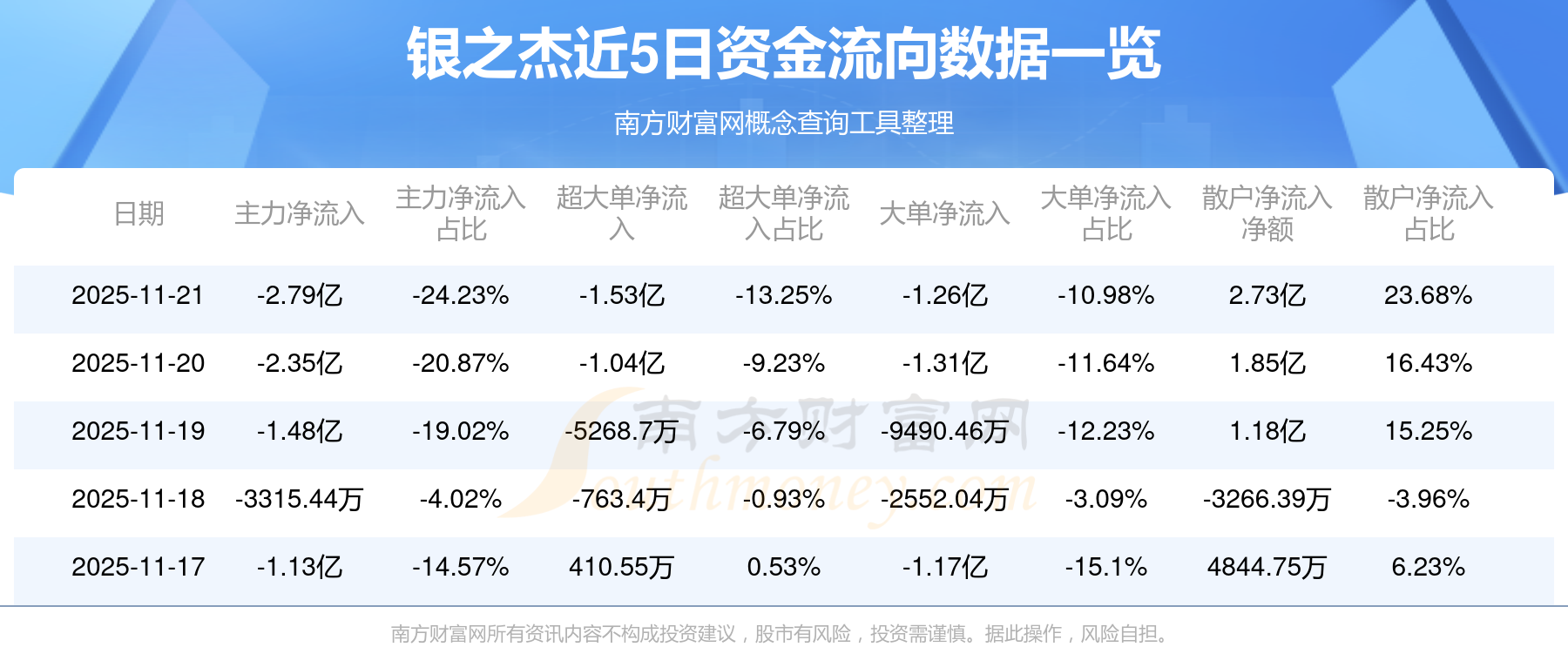 11月21日消息,銀之杰主力資金凈流出2.79億元,超大單資金凈流出1.53億元,散戶資金凈流入2.73億元。