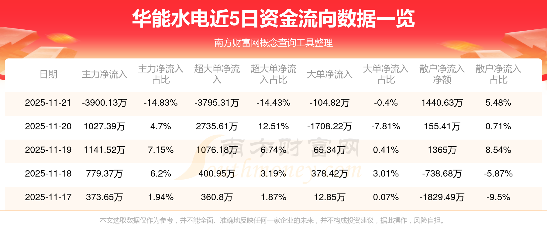 11月14日15點收盤,華能水電(600025)跌0.62%,報9.460元,成交量2750.49萬手,市盈率為21.5倍。