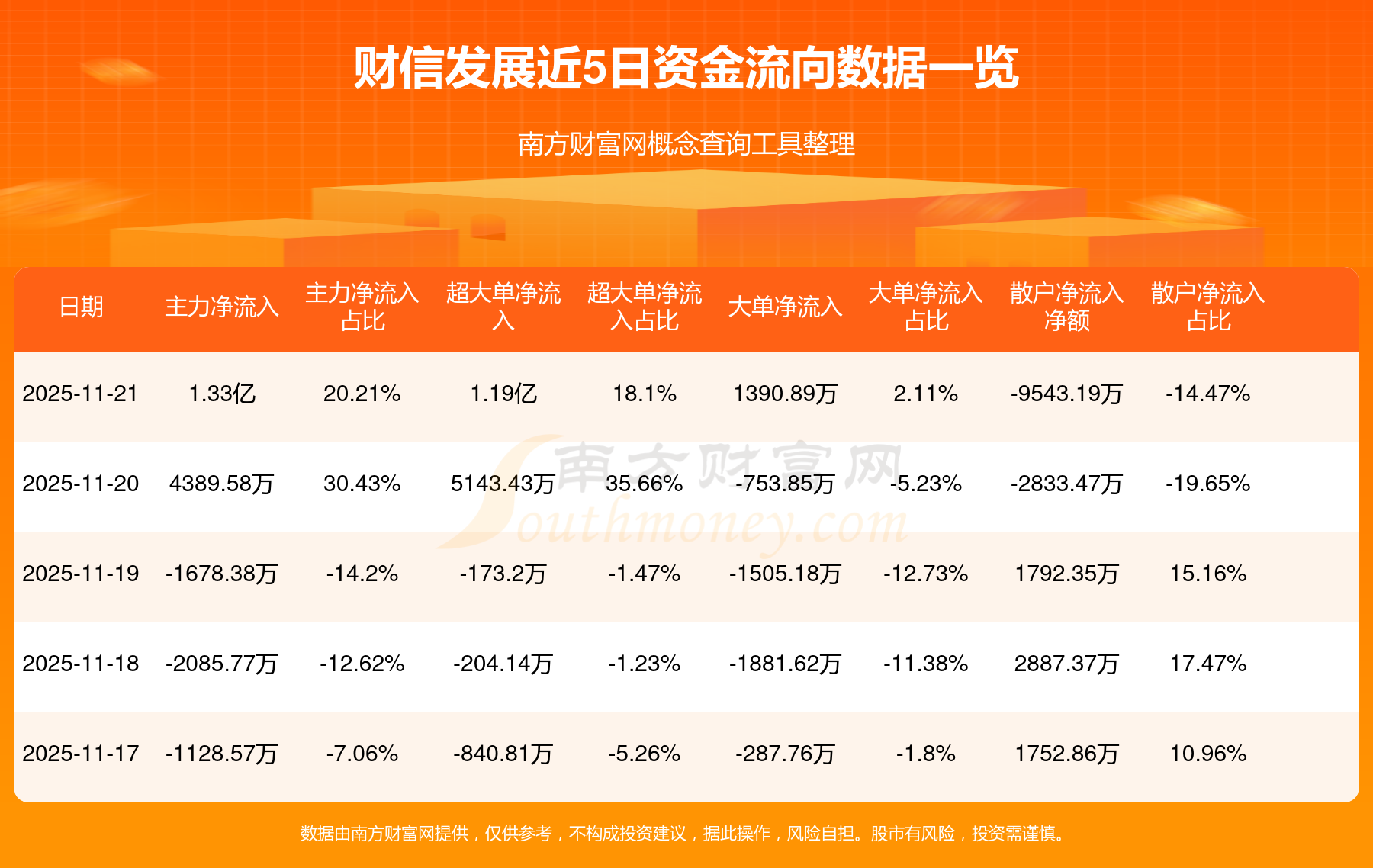 11月21日消息,財信發(fā)展主力凈流入1.33億元,超大單凈流入1.19億元,散戶凈流出9543.19萬元。