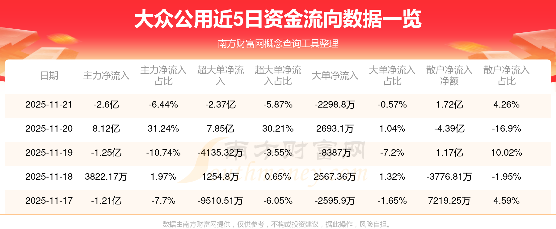 11月21日消息,大眾公用主力凈流出2.6億元,超大單凈流出2.37億元,散戶(hù)凈流入1.72億元。