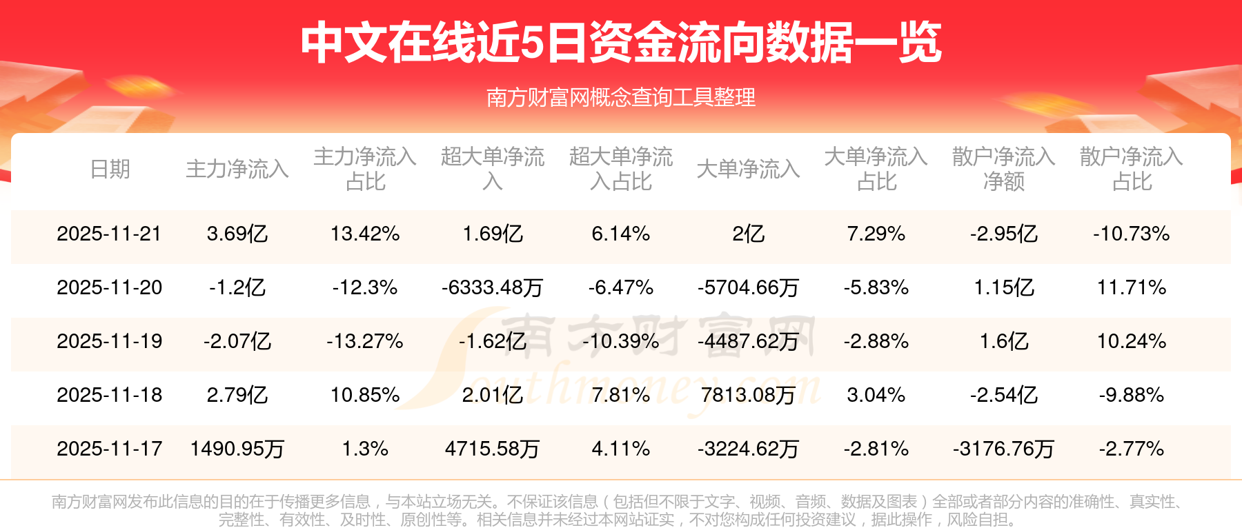 11月21日該股主力凈流入3.69億元,超大單凈流入1.69億元,大單凈流入2億元,中單凈流出7405.56萬元,散戶凈流出2.95億元。