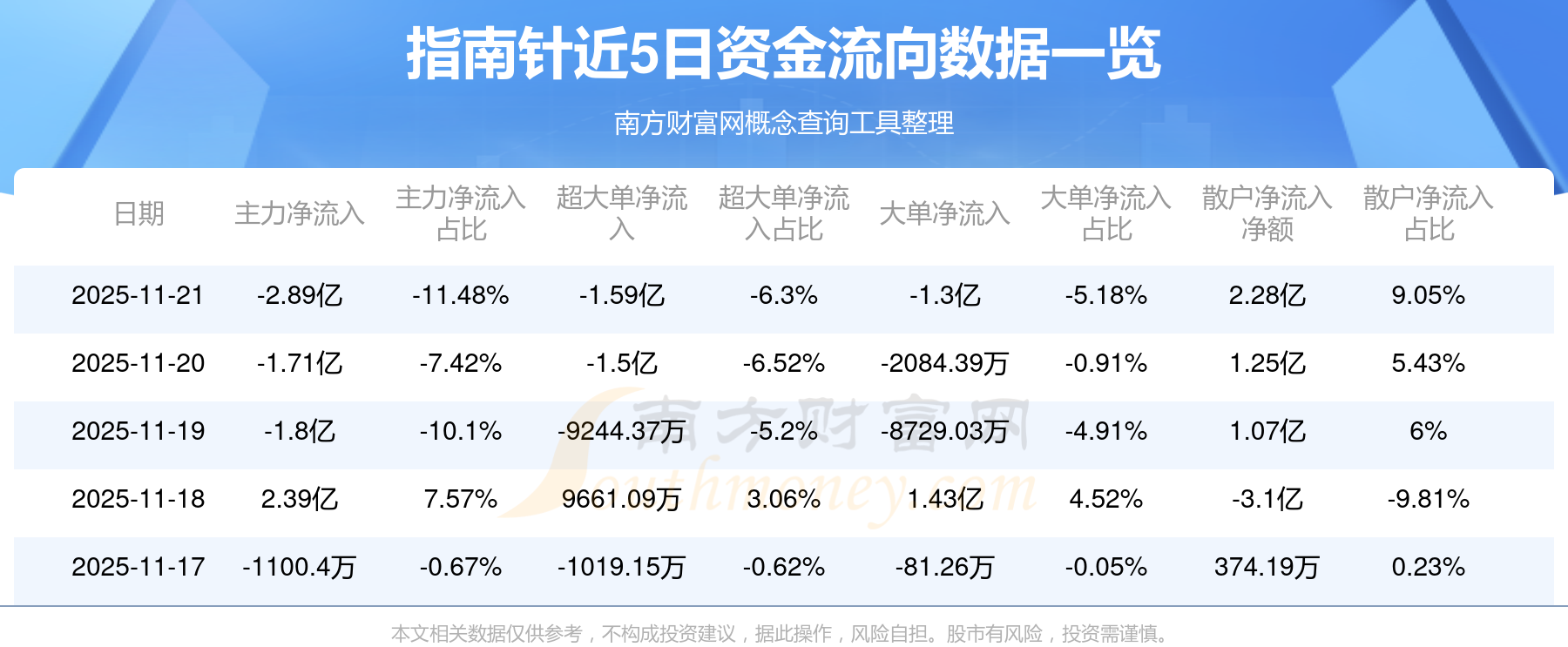 11月21日消息,指南針主力凈流出2.89億元,超大單凈流出1.59億元,散戶凈流入2.28億元。