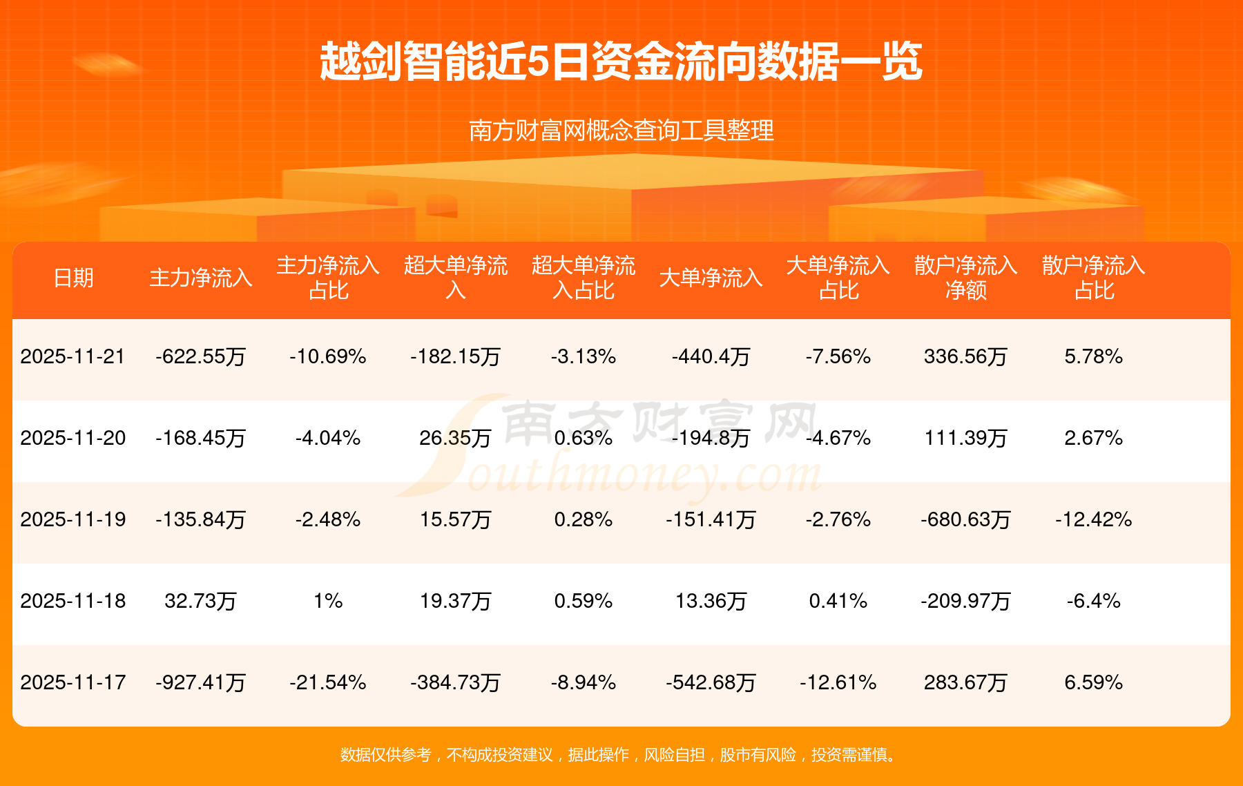 11月21日消息,越劍智能資金凈流出622.55萬元,超大單凈流出182.15萬元,換手率1.54%,成交金額5822.47萬元。