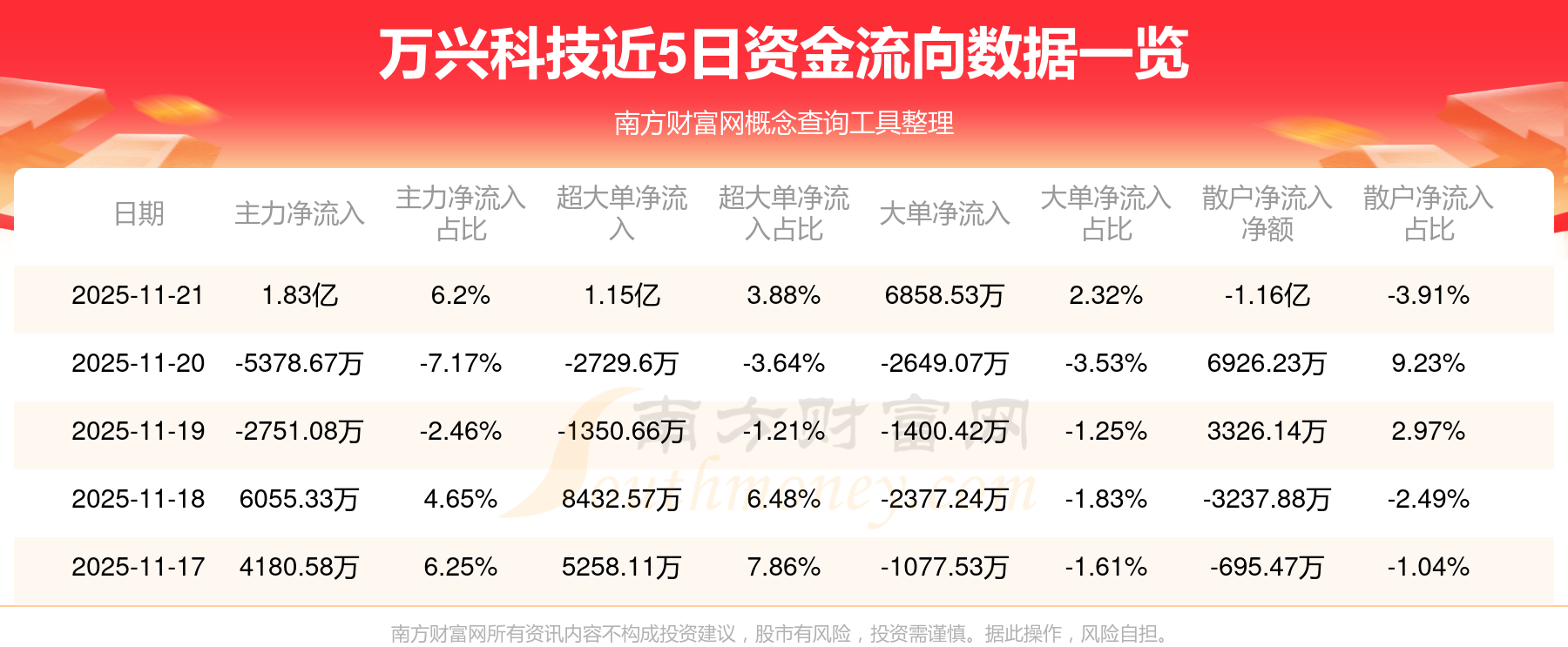 11月21日消息,萬興科技資金凈流入1.83億元,超大單資金凈流入1.15億元,換手率22.44%,成交金額29.61億元。