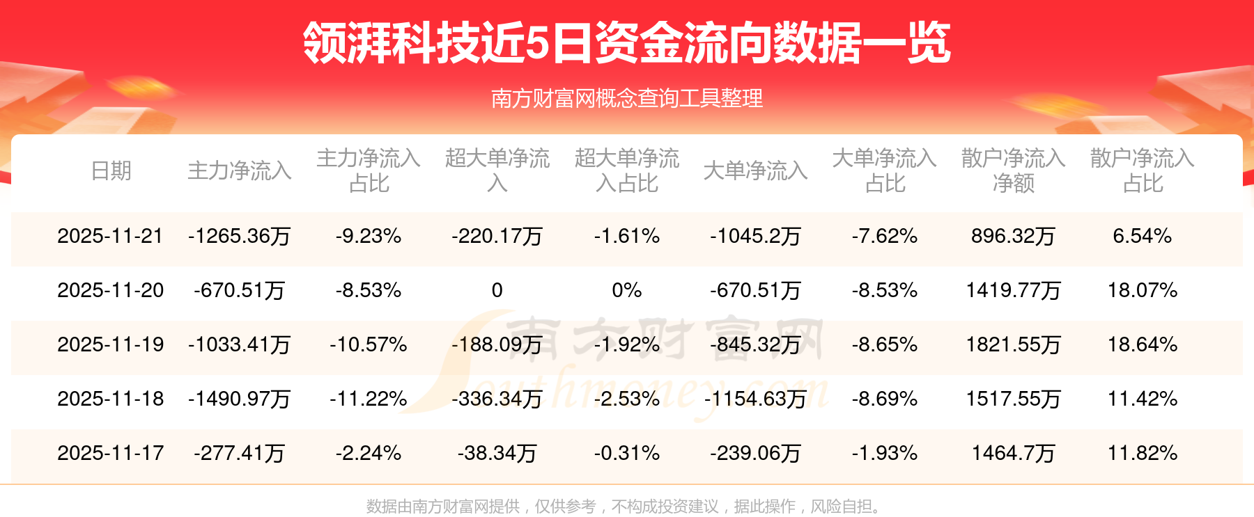 11月21日消息,領(lǐng)湃科技11月21日主力資金凈流出1265.36萬元,超大單資金凈流出220.17萬元,大單資金凈流出1045.2萬元,散戶資金凈流入896.32萬元。
