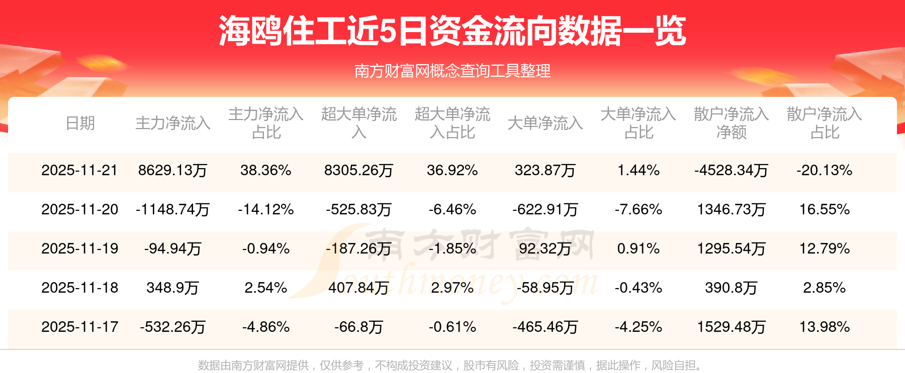 11月21日消息,海鷗住工主力凈流入8629.13萬(wàn)元,超大單凈流入8305.26萬(wàn)元,散戶凈流出4528.34萬(wàn)元。