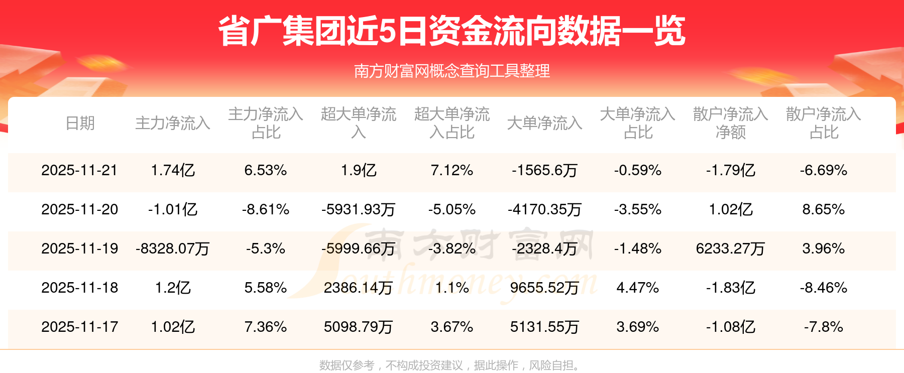 11月21日消息,省廣集團11月21日主力凈流入1.74億元,超大單凈流入1.9億元,大單凈流出1565.6萬元,散戶凈流出1.79億元。