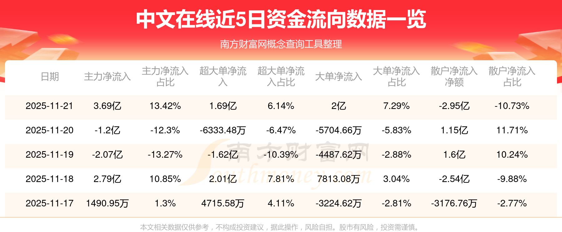 近5日資金流向一覽見下表: