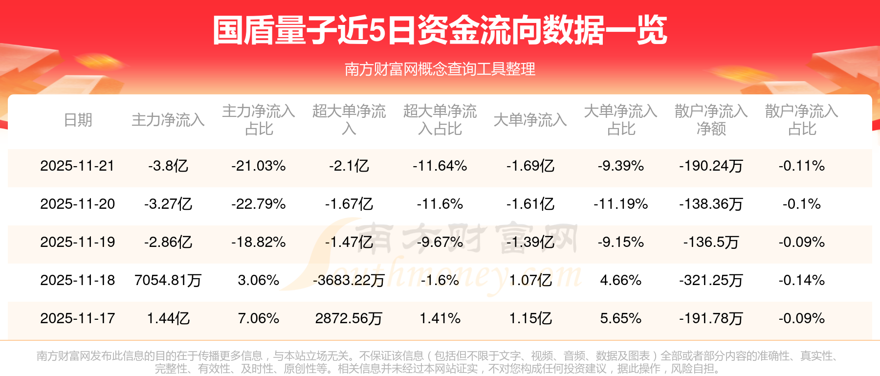 11月21日消息,國(guó)盾量子11月21日主力凈流出3.8億元,超大單凈流出2.1億元,大單凈流出1.69億元,散戶凈流出190.24萬(wàn)元。