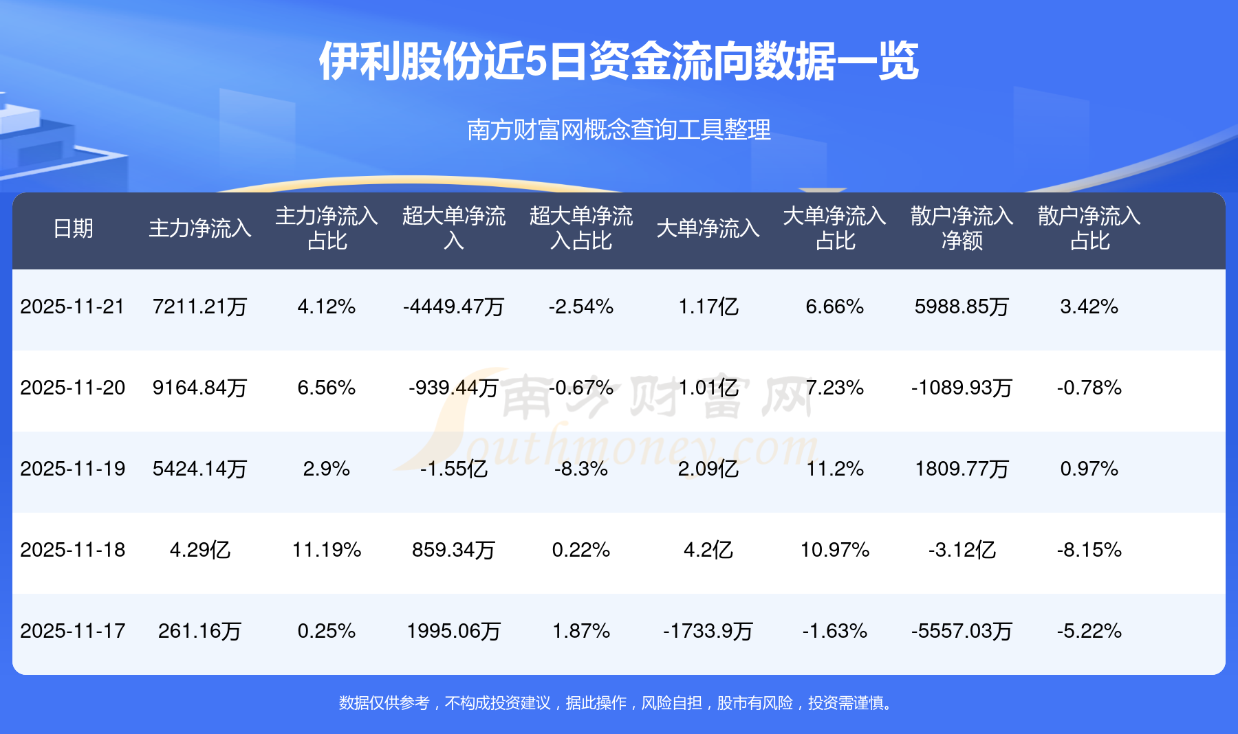 11月21日消息,伊利股份主力凈流入7211.21萬(wàn)元,超大單凈流出4449.47萬(wàn)元,散戶凈流入5988.85萬(wàn)元。