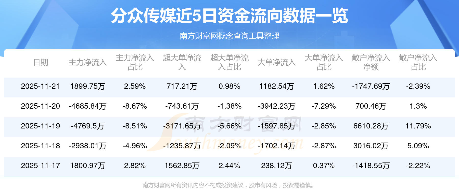 11月21日消息,分眾傳媒資金凈流入1899.75萬(wàn)元,超大單凈流入717.21萬(wàn)元,換手率0.67%,成交金額7.32億元。