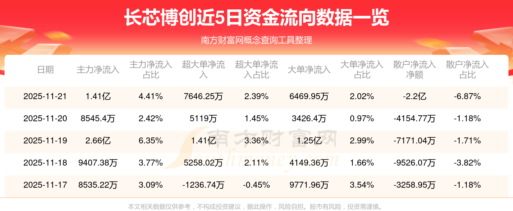 11月21日消息,長(zhǎng)芯博創(chuàng)主力凈流入1.41億元,超大單凈流入7646.25萬(wàn)元,散戶(hù)凈流出2.2億元。