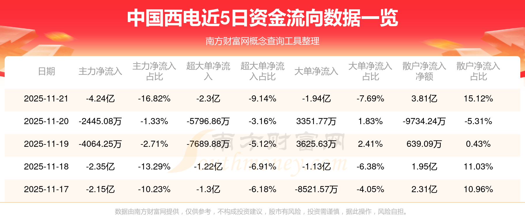 11月21日主力資金凈流出4.24億元,超大單資金凈流出2.3億元,換手率6.04%,成交金額25.18億元。