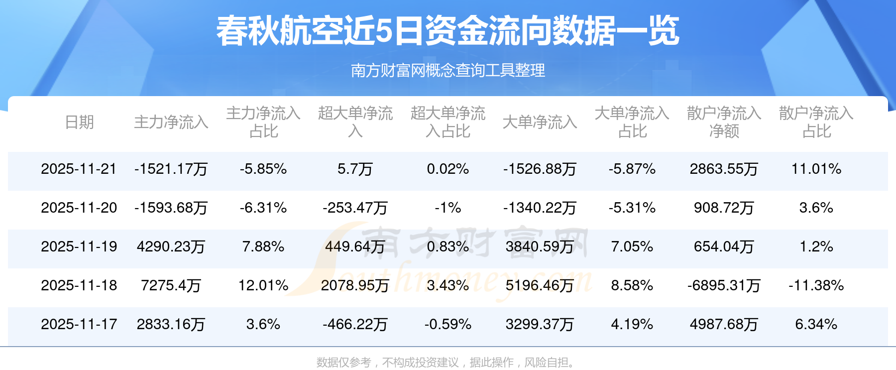 11月21日消息,春秋航空11月21日主力凈流出1521.17萬元,超大單凈流入5.7萬元,大單凈流出1526.88萬元,散戶凈流入2863.55萬元。