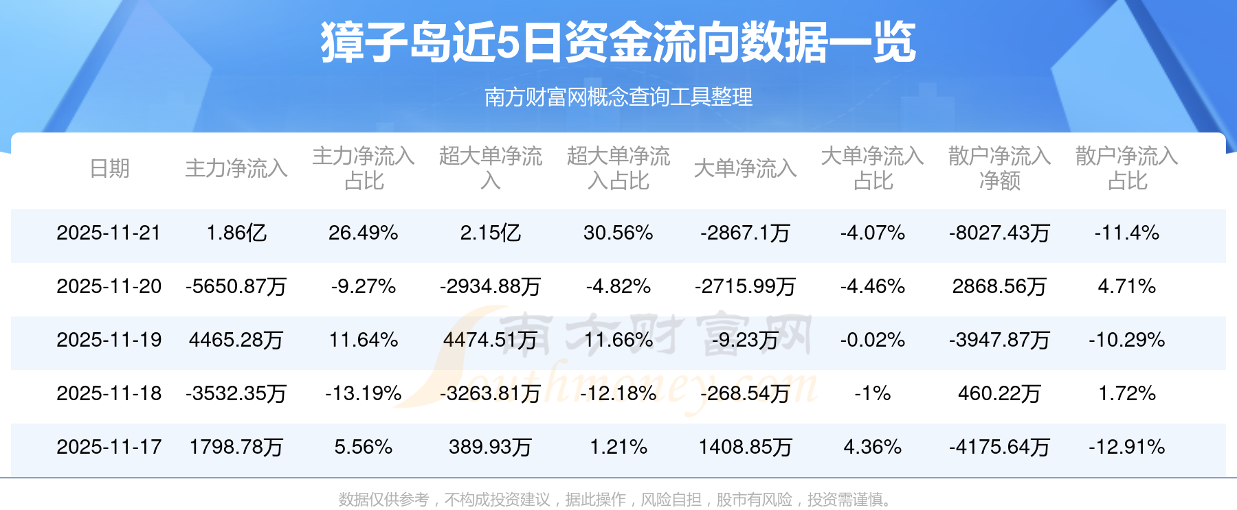 11月21日消息,獐子島主力凈流入1.86億元,超大單凈流入2.15億元,散戶凈流出8027.43萬元。