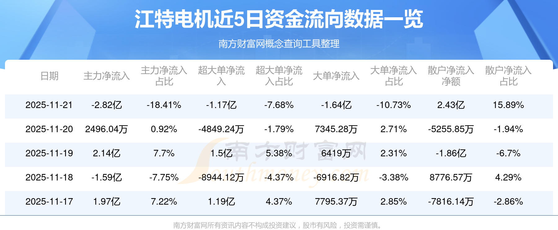 資金流向數(shù)據(jù)方面,11月21日主力資金凈流流出2.82億元,超大單資金凈流出1.17億元,大單資金凈流出1.64億元,散戶資金凈流入2.43億元。