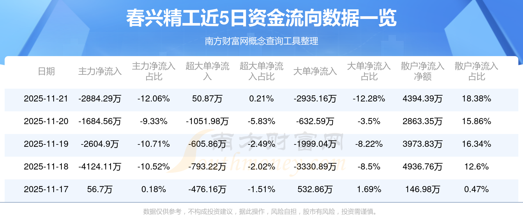 11月21日消息,春興精工資金凈流出2884.29萬元,超大單凈流入50.87萬元,換手率4.51%,成交金額2.39億元。