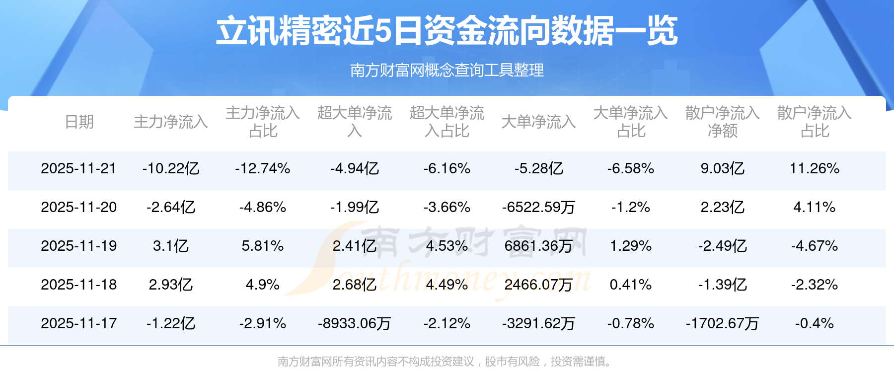 11月21日該股主力凈流出10.22億元,超大單凈流出4.94億元,大單凈流出5.28億元,中單凈流入1.19億元,散戶凈流入9.03億元。