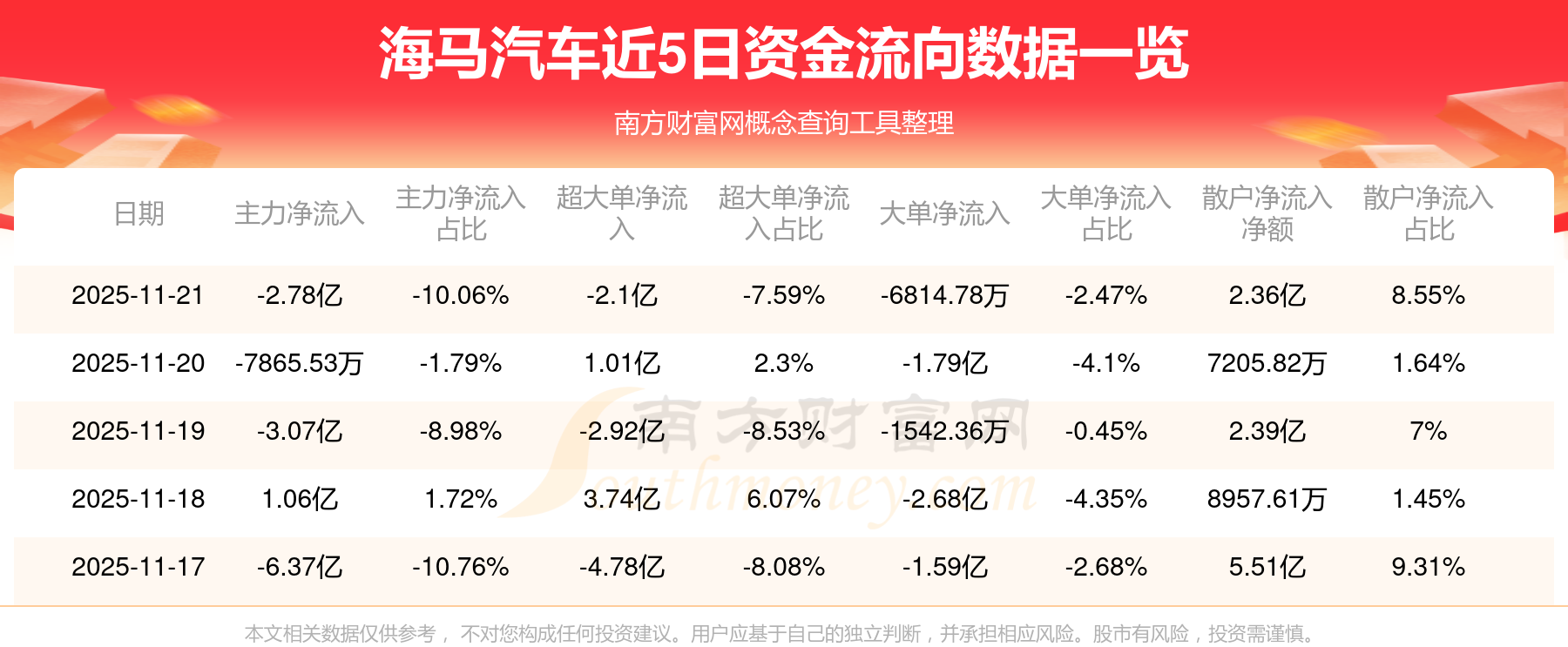 11月21日消息,海馬汽車11月21日主力凈流出2.78億元,超大單凈流出2.1億元,大單凈流出6814.78萬元,散戶凈流入2.36億元。