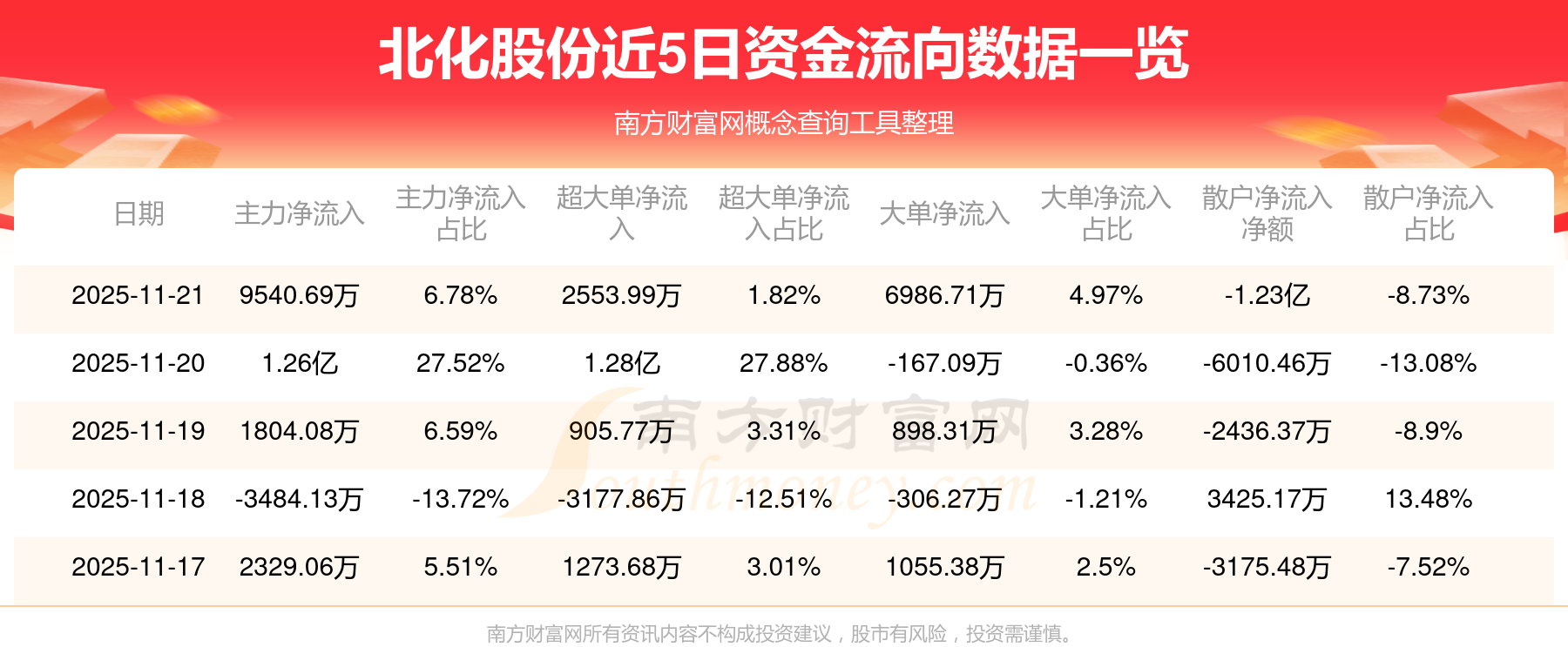 11月21日消息,北化股份11月21日主力凈流入9540.69萬元,超大單凈流入2553.99萬元,大單凈流入6986.71萬元,散戶凈流出1.23億元。