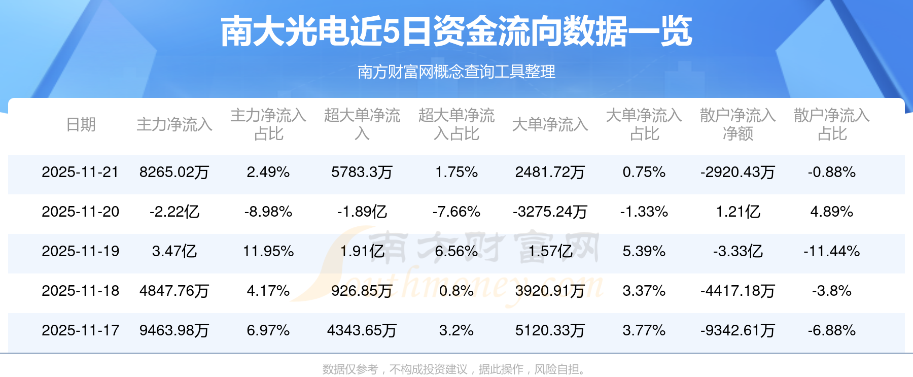 11月21日消息,南大光電11月21日主力資金凈流入8265.02萬元,超大單資金凈流入5783.3萬元,大單資金凈流入2481.72萬元,散戶資金凈流出2920.43萬元。