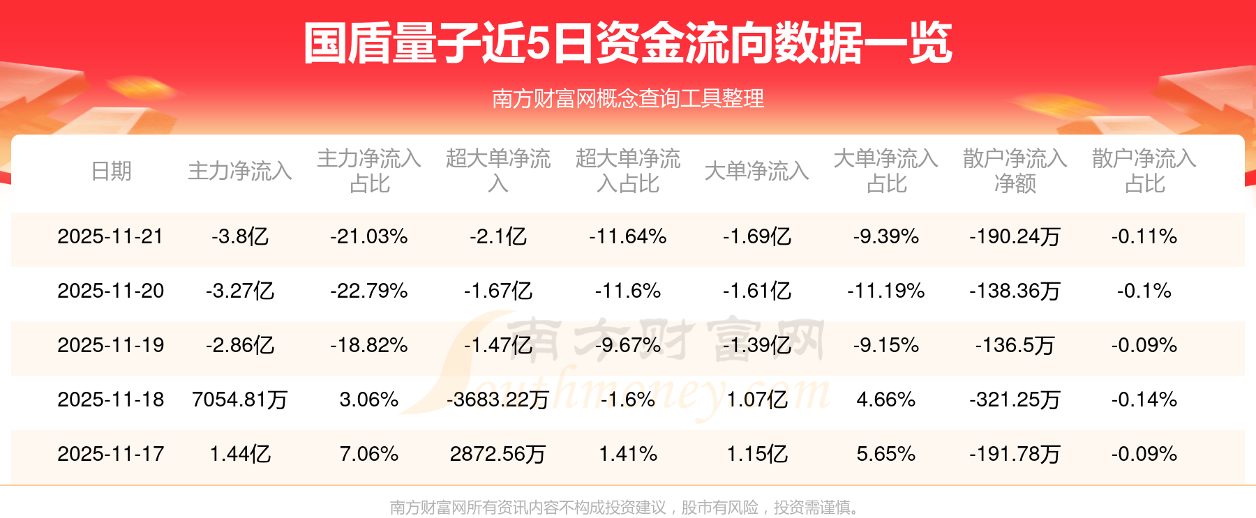 11月21日消息,國盾量子主力凈流出3.8億元,超大單凈流出2.1億元,散戶凈流出190.24萬元。