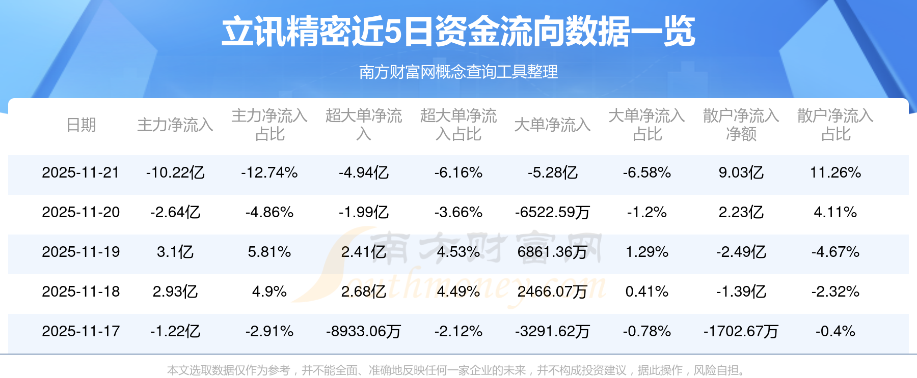 11月21日消息,立訊精密11月21日主力凈流出10.22億元,超大單凈流出4.94億元,大單凈流出5.28億元,散戶凈流入9.03億元。